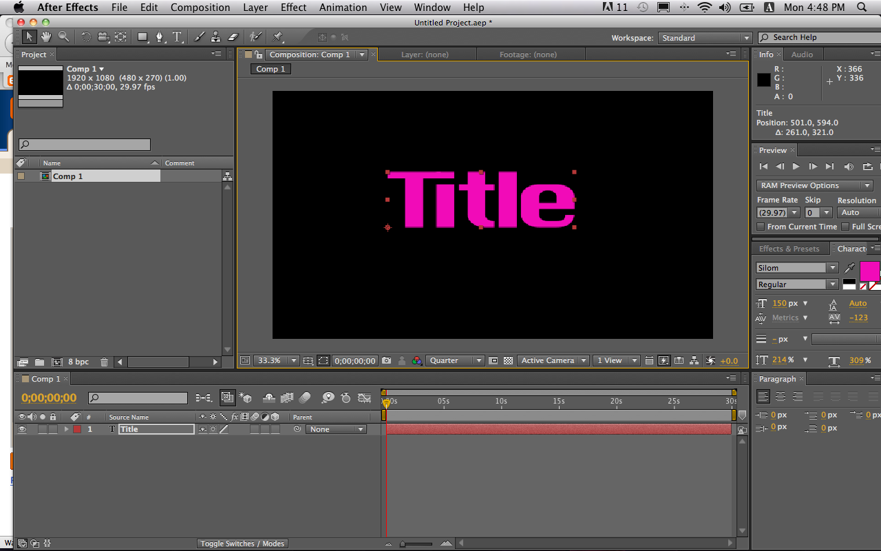 文字ツール(⌘+T)を選択して、テキストを入力したいコンポジションパネルの上をクリック。